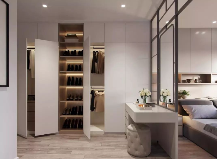 衣柜对于卧室来说必不可少,想要保持整洁又要大面积的收纳空间,合理的布局设计不可小觑。整体设计的衣柜,不仅能分类收纳衣物,还是与墙面充分融合,不会显得压抑。