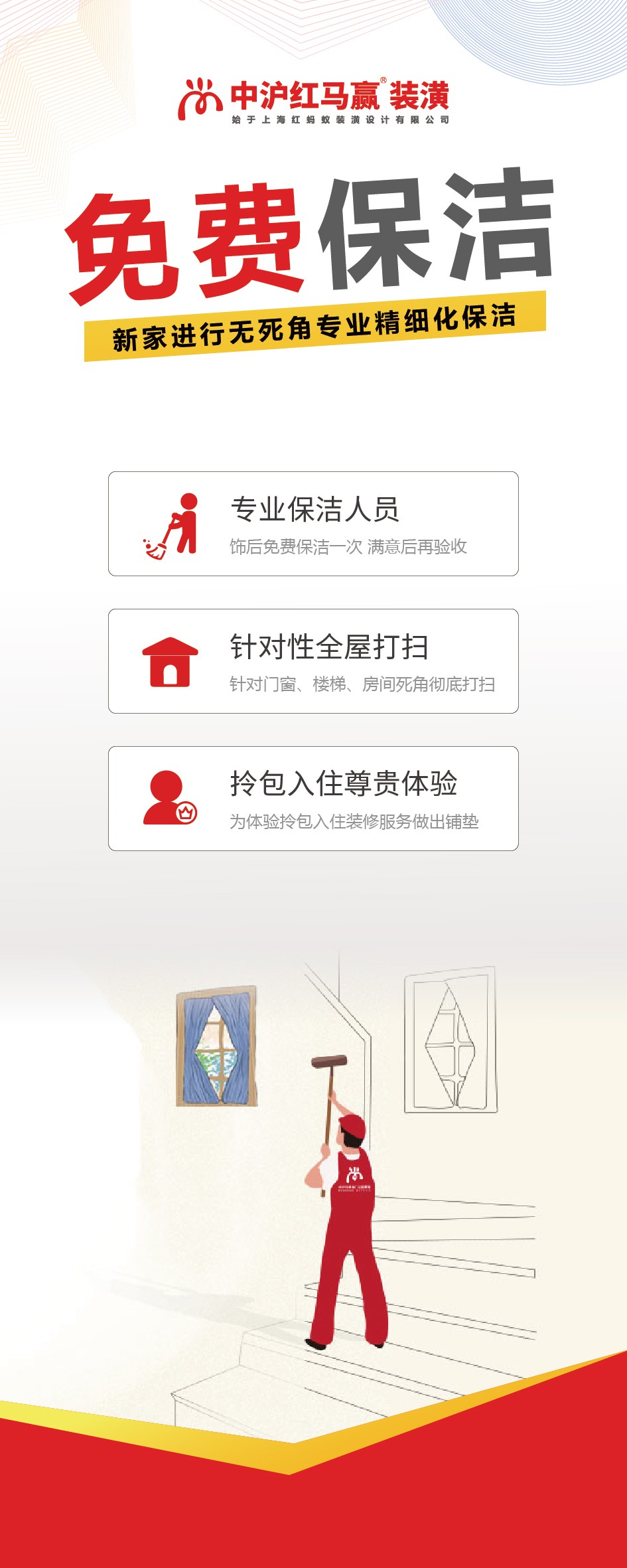1.不清楚装修的开荒保洁工作有多累? 开荒是清洁工程之首,由于建筑工程中常常会遗留下许多垃圾污垢,各种地面石头,墙壁上会遗留下水泥浆块、油漆、玻璃胶、水污、锈迹等,这些都必须在开荒工作中清洗干净。 开荒保洁不像日常清洁,需要从上到下、从里到外、上至天花板,下至地砖缝隙都使用专业的工具处理干净,这个流程做不好,就会留下一些装修痕迹,影响整个家的美感及居住体验。整套清洁做下来,腰也费得差不多了。 2.找保洁公司打扫房屋又麻烦又费钱? 开荒保洁是一件非常麻烦且费时费力的工作,加上工具上的不专业和经验上的欠缺,自己做无疑不是一场艰难的工程。但在入住前特地找保洁公司做开荒保洁的话,需要甄别保洁公司的资质,详细了解它的服务范围和收费标准等等,麻烦不说,还要增加一笔额外的开销。 3.家具物品回搬还得再找搬家公司? 装修完工、开荒保洁工作完成后并不等于大功告成了,后续家具家电需要回搬、安装等,自己搬不仅费时费力,还可能因为不了解专业安装问题影响到家电的使用;选择搬家公司同样很麻烦,流程繁琐、费用不清晰,不知道如何选才能省心省力省钱。 中沪红马赢&品然整装 中沪红马赢装潢始于上海红蚂蚁装潢设计有限公司,成立于2003年,拥有建筑装修装饰工程专业承包二级资质与设计乙级资质。专注于室内装饰一站式整装品牌,旗下拥有上海红蚂蚁装潢设计有限公司、上海红蚂蚁建筑劳务有限公司,上海品然空间装饰设计工程有限公司、上海品然空间建筑科技有限公司。 公司下设26家门店,拥有300多位资深设计师,数千名专业工匠。拥有20余项国家专利和156金牌标准工艺,起草并制定了上海市消保委家庭装潢验收规范多项标准,是行业核心标准的制定者、行业规范的引领者。 中沪红马赢&品然整装,作为有着二十多年丰富装修经验的家装领先品牌,始终坚持以专业化施工、个性化定制、人性化服务赢得家装消费者的信任与满意,公司创立的六大特色服务体系为无数业主解决了装修顾虑,真正让客户感受到省心,安心、放心。其中的保洁回搬服务更是以专业的开荒保洁和正规的家具回搬实实在在解决了装修完工后的收尾工作。 一保洁回搬服务优势 …… 1. 专业保洁人员及工具 (专业 高效) 公司有着多年家装经验,在行业内首创了多项便民措施与特色服务。多年的开荒保洁服务经验,专业的保洁服务团队,正规明确的岗位职责和操作规章,已累计服务超5W家,经验丰富,荣誉满载。且员工上岗前都经过专业的培训,只为给业主带来一个舒适、健康的生活环境,高效帮您入住新家。 2.一站式饰后保洁回搬 (省心 全面) 公司提供正规搬家公司一体化一站式免费搬家,全程专业拆装、精细打包,并提供饰后回搬服务,帮助客户精细归置、码放家具,使您的新居不仅舒适美观,还能提供更多的可利用空间。且每个项目流程都有专门的管理人员及时与客户进行沟通、了解进展和解答疑问,向客户提供更贴心、个性化的服务。 3.无任何额外费用 (省钱 安心) 公司秉持‘客户利益至上’原则,签订明确的闭口合同及服务协议,做到0增项、0漏项;无任何额外费用、清晰稳定,省钱安心。 二保洁回搬服务流程 …… 1.装修竣工验收 2.申请开荒保洁服务 3.安排专业保洁人员上门 4.根据现场情况及要求安排保洁工作 5.保洁完工后验收签字 6.提前3天申请回搬需求 7.根据入库清单回搬物品 8.搬至新家业主验收签字 三保洁回搬服务注意事项 …… 1. 保洁回搬服务仅限本公司签约装修业主 2. 需提前2天与施工队长联系安排保洁人员 3. 需提前3天与设计师联系,确定回搬时间 End