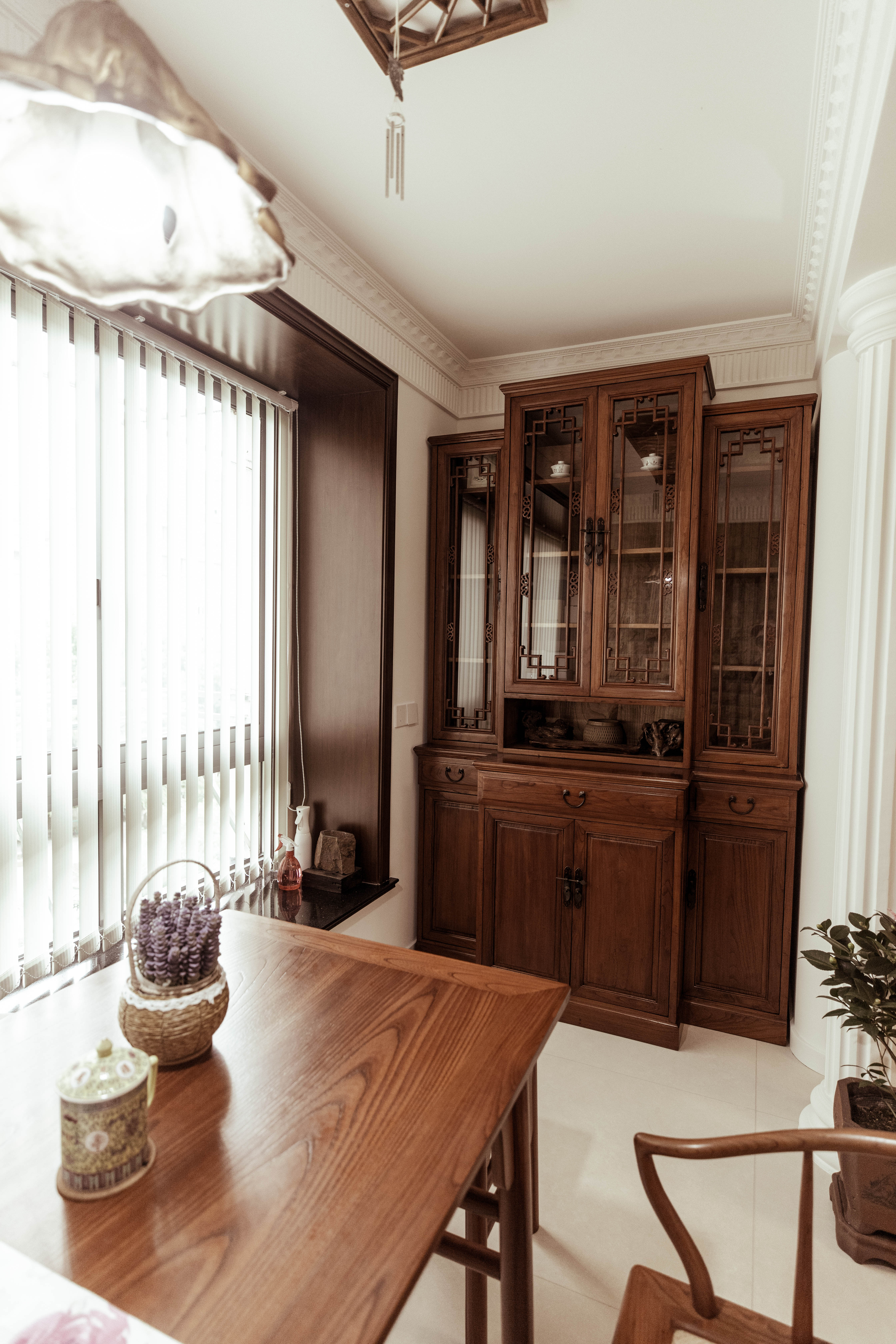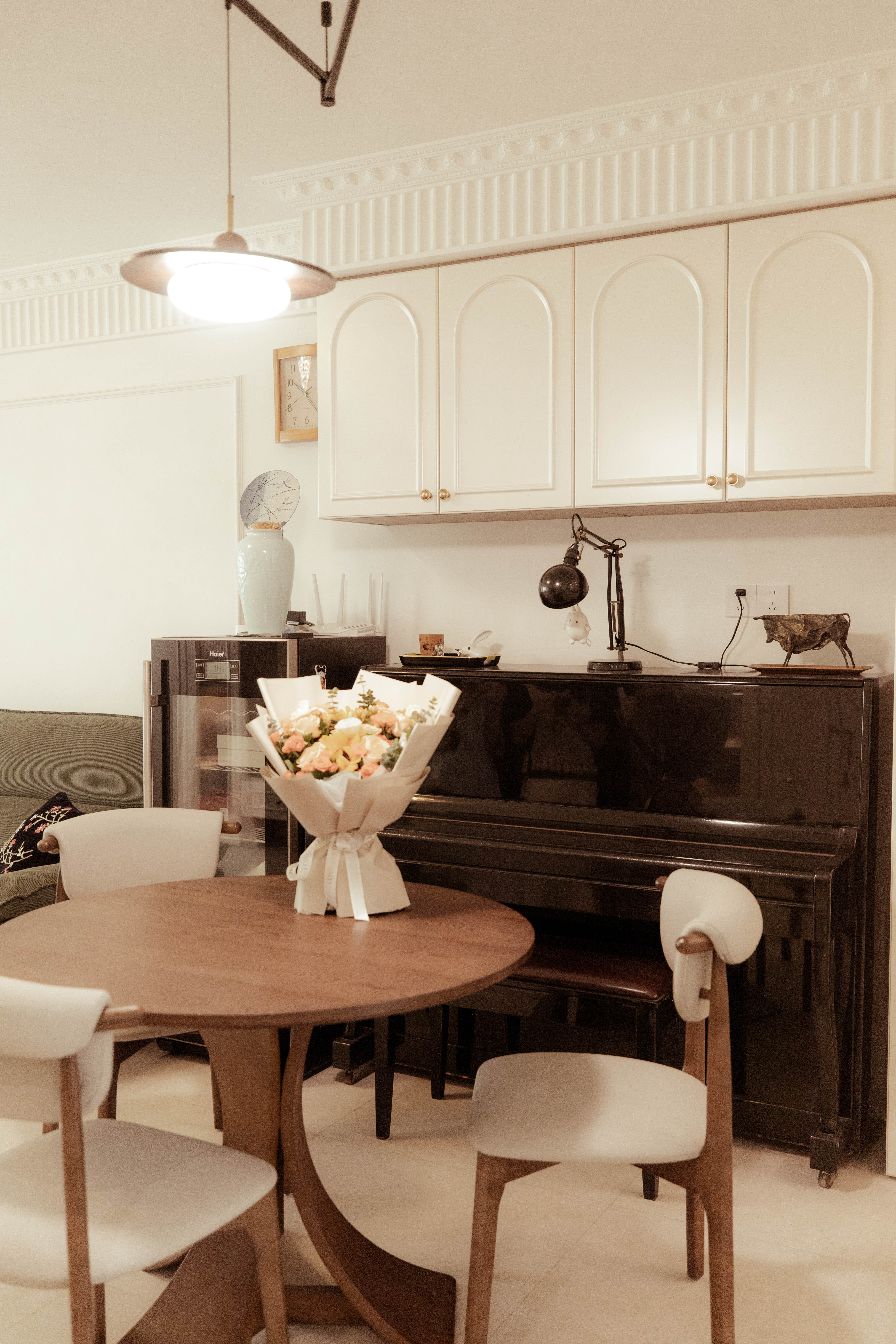 1.放大空间:复古隔断作端景,弱化客餐厅与玄关、厨卫的边界感。 2.钢琴移位盘活两面墙:释放客厅空间,整墙电视柜满足收纳+装饰+展示需求。钢琴自然划分客餐厅,营造优雅就餐氛围。 3.茶室搬进阳台:旧家具进厂涂漆翻新,和新家整体色调保持统一。 4.厨房连通工作阳台,家务区集中归置,动线优化。