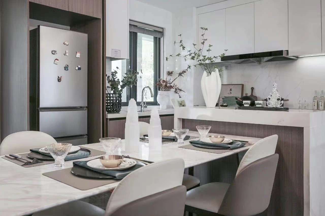 这个70㎡米二房户型市面少有,是专为常态化的三口之家所准备。虽不大,但一应俱全。 客餐连体的格局下,餐厅运用光带围绕勾画原木木饰面的手法轻松将客餐厅区域合理分割,也提亮了光线。 客厅大理石电视墙桌材质简练,形成一体,黑白色调朴素分明,彰显“后浪”练达风格!