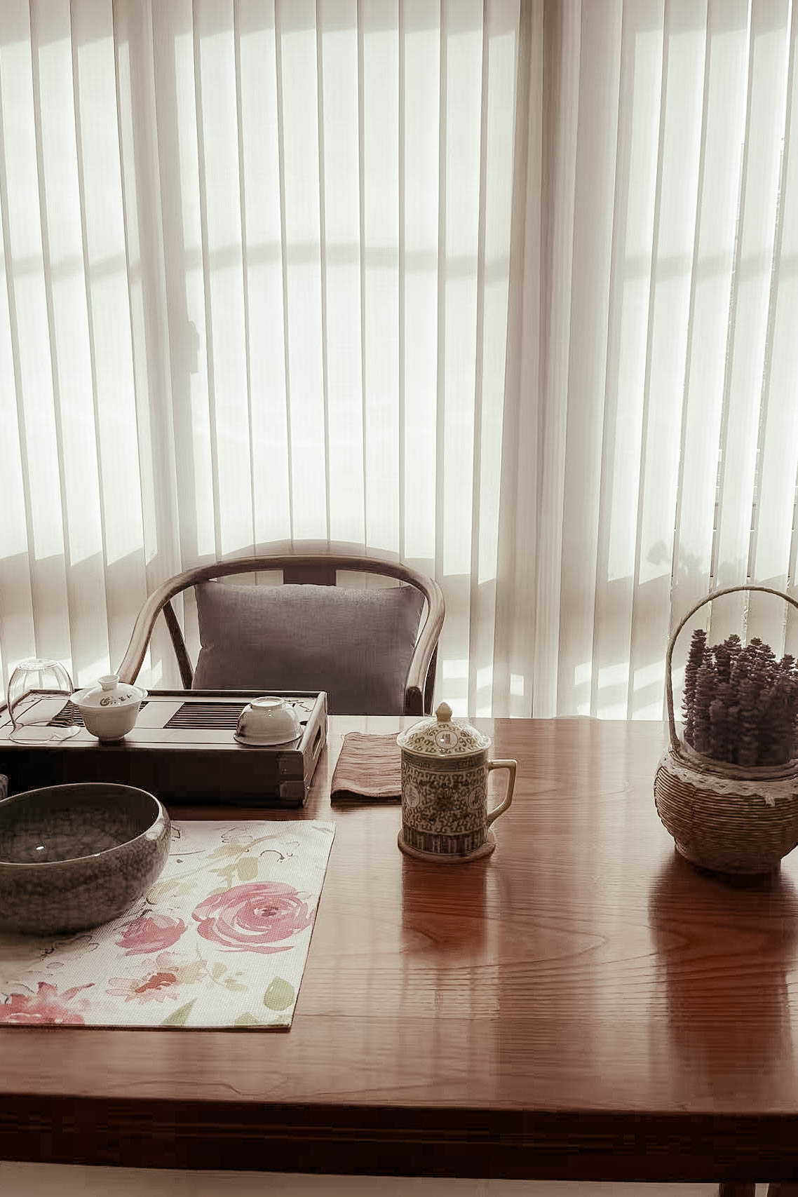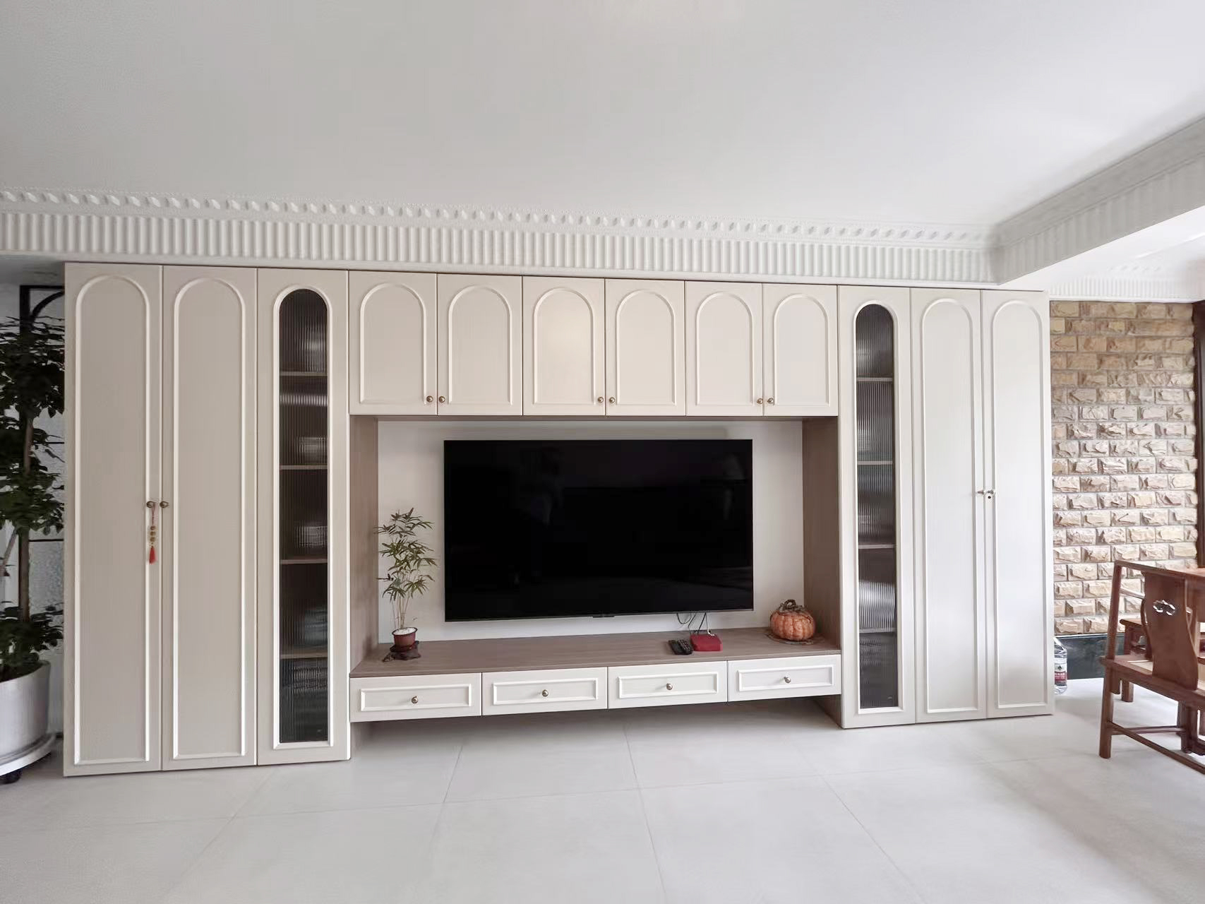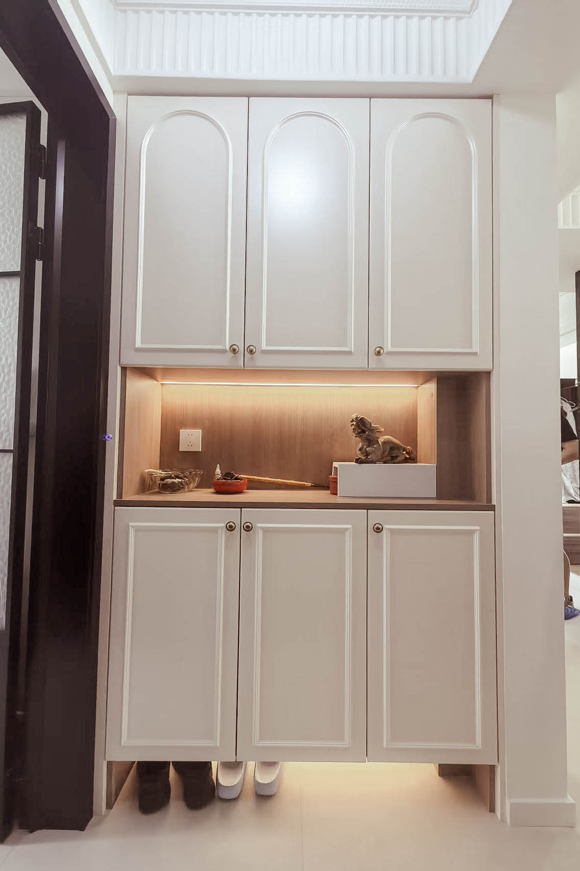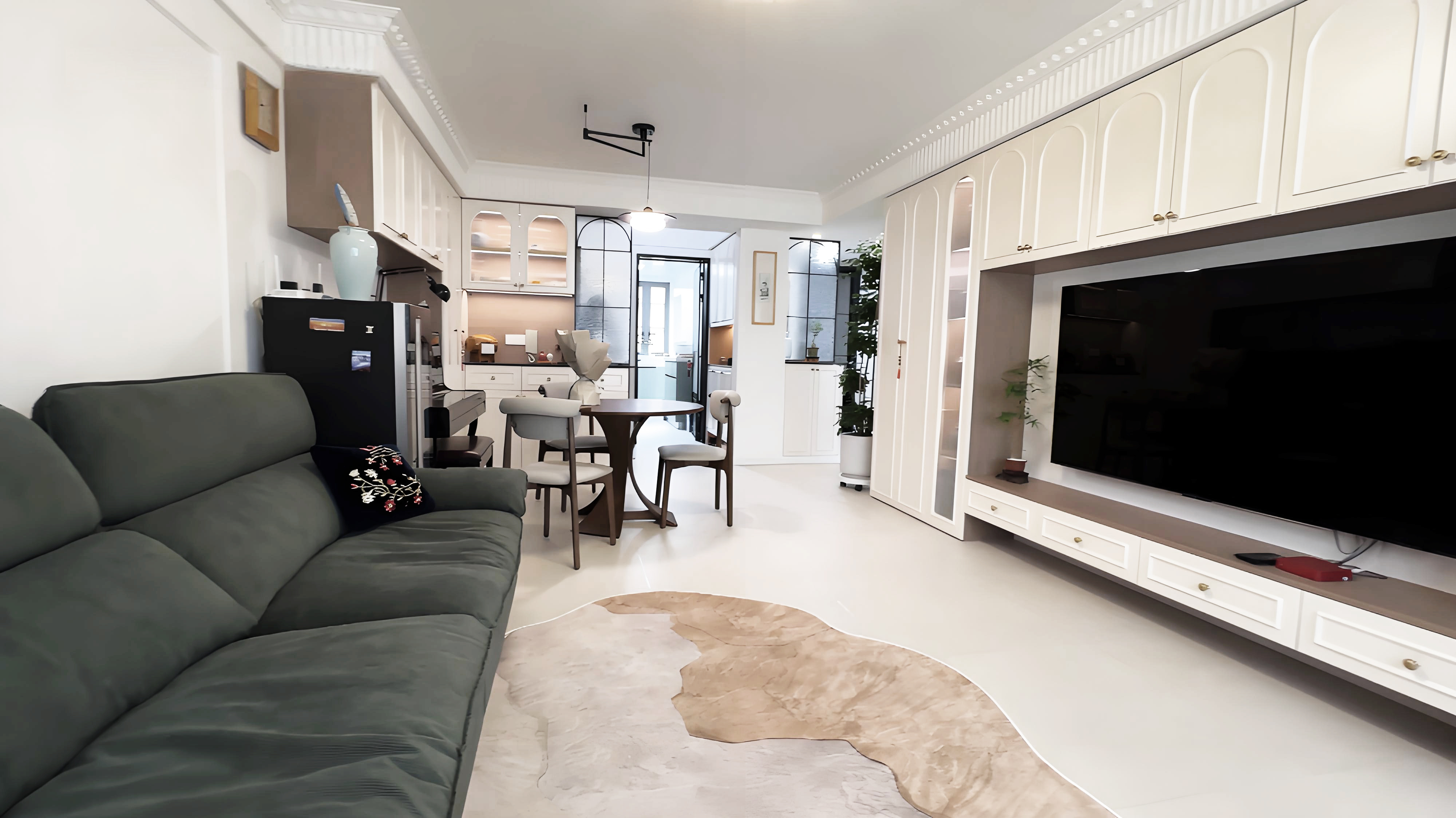 1.放大空间:复古隔断作端景,弱化客餐厅与玄关、厨卫的边界感。 2.钢琴移位盘活两面墙:释放客厅空间,整墙电视柜满足收纳+装饰+展示需求。钢琴自然划分客餐厅,营造优雅就餐氛围。 3.茶室搬进阳台:旧家具进厂涂漆翻新,和新家整体色调保持统一。 4.厨房连通工作阳台,家务区集中归置,动线优化。
