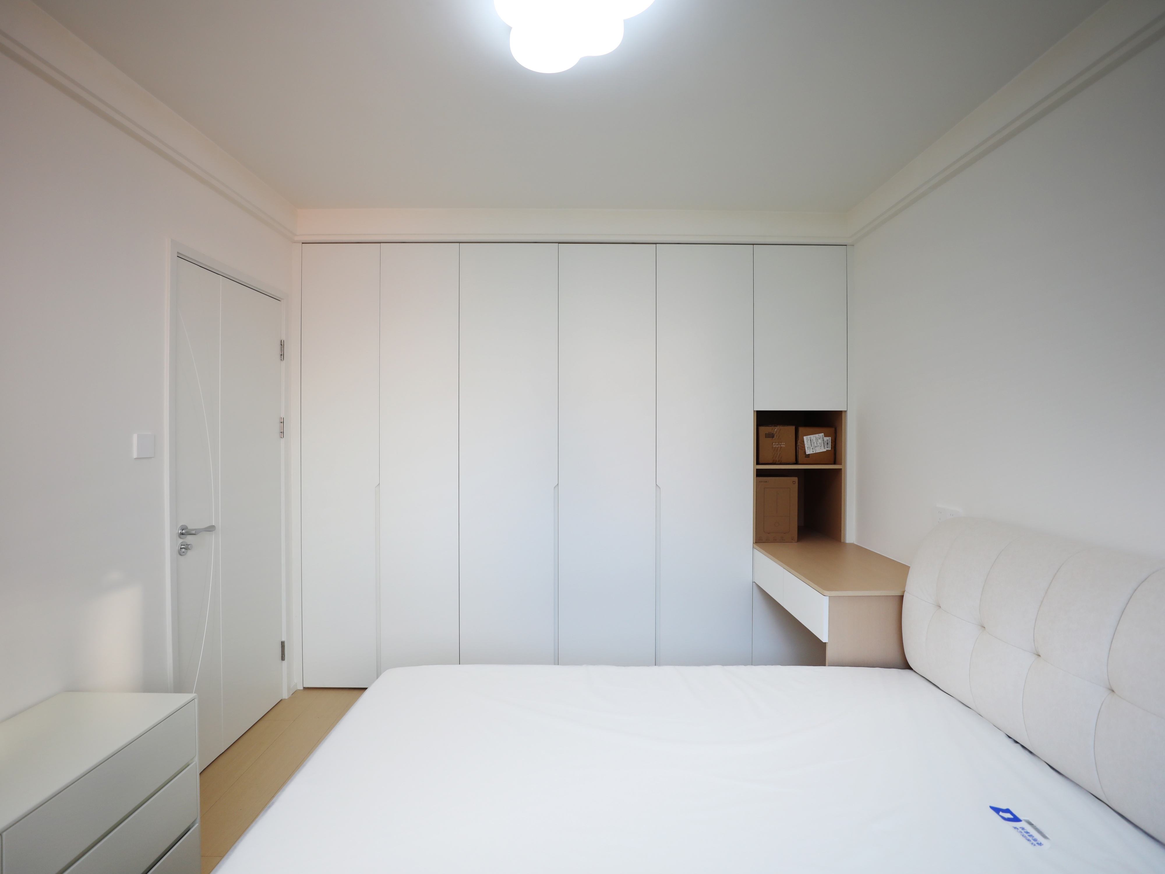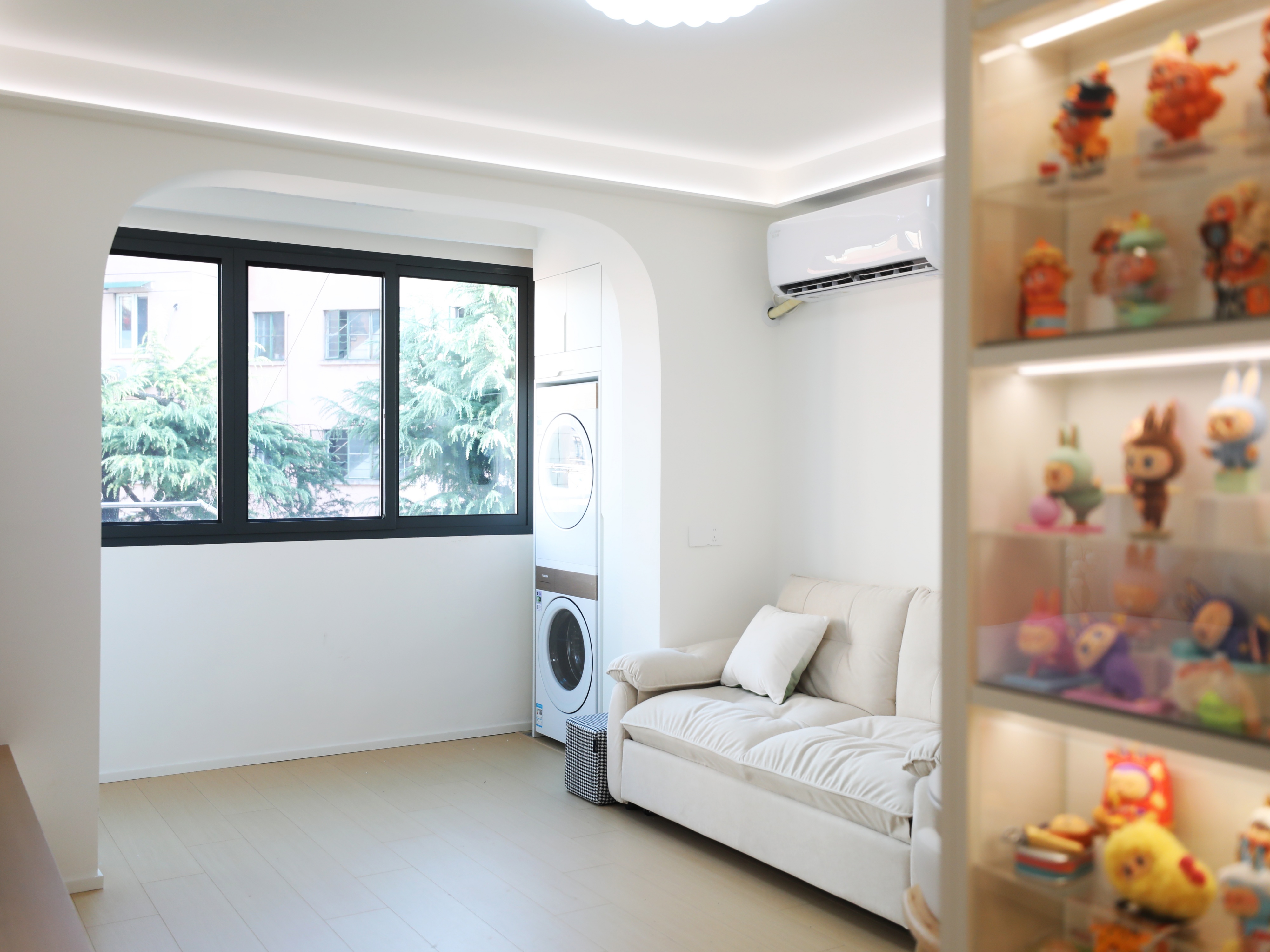 45㎡的两室户老房,无客餐厅,一条狭窄走道连通厨卫和两间卧室,通风采光不佳。王先生想要给喜爱星星人和LABUBU的未婚妻一个有爱的小家,他与同样喜欢潮玩的设计师马健丽一拍即合,通过全屋定制,打造出一个通透实用、兼顾萌宠与收藏的奶油风婚房